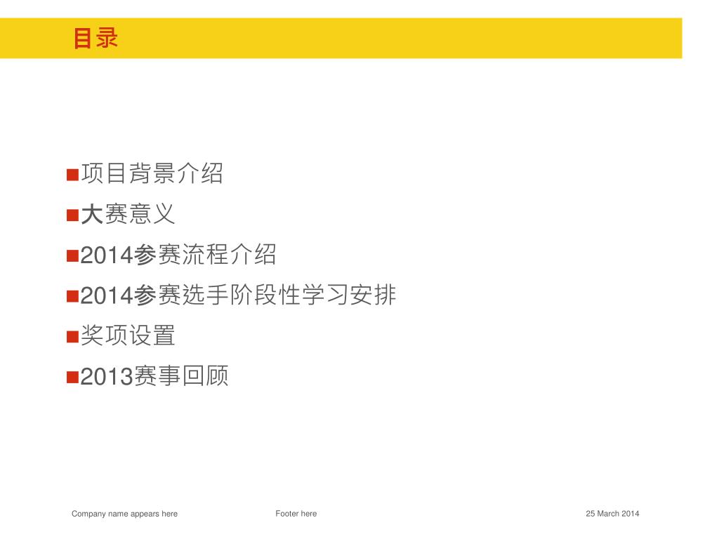 目录 • 项目背景介绍 • 大赛意义 • 2014参赛流程介绍 • 2014参赛选手阶段性学习安排 • 奖项设置 • 2013赛事回顾 Footer here