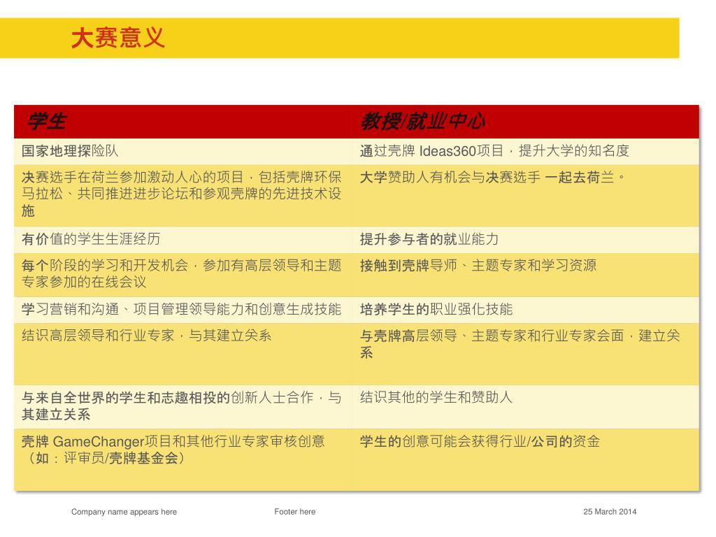 2014参赛流程介绍 • 2014年壳牌ideas360的主题是“人与星球——能源、水和食物挑战”。所有个人参与者或团队均需开发与一个或多个挑战有关的创新理念和提案。 Footer here
