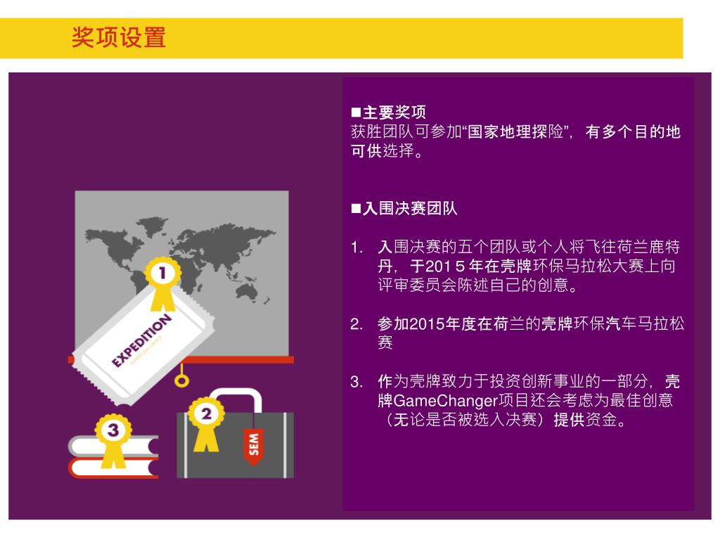 奖项设置 • 主要奖项 • 获胜团队可参加“国家地理探险”,有多个目的地可供选择。 • 入围决赛团队 • 入围决赛的五个团队或个人将飞往荷兰鹿特丹,于2015年在壳牌环保马拉松大赛上向评审委员会陈述自己的创意。 • 参加2015年度在荷兰的壳牌环保汽车马拉松赛 • 作为壳牌致力于投资创新事业的一部分,壳牌GameChanger项目还会考虑为最佳创意(无论是否被选入决赛)提供资金。
