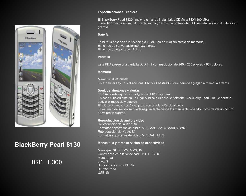 Especificaciones Técnicas El BlackBerry Pearl 8130 funciona en la red inalámbrica CDMA a 850/1900 MHz.Tiene 107 mm de altura, 50 mm de ancho y 14 mm de profundidad. El peso del teléfono (PDA) es 96 gramos. Batería La batería basada en la tecnología Li-Ion (Ion de litio) sin efecto de memoria. El tiempo de conversación son 3,7 horas.El tiempo de espera son 9 días. Pantalla Este PDA posee una pantalla LCD TFT con resolución de 240 x 260 pixeles x 65k colores. Memoria Memoria ROM: 64MBEn el celular hay un slot adicional MicroSD hasta 8GB que permite agregar la memoria externa Sonidos, ringtones y alertas El PDA puede reproducir Polyphonic, MP3 ringtones.En caso si usted está en un lugar publico o ruidoso, el teléfono BlackBerry Pearl 8130 le permite activar el modo de vibración.El teléfono también está equipado con una función de altavoz.El volumen de sonido se puede regular tanto desde los menús del aparato, como desde un control de volumen externo. Reproducción de audio y vídeo Reproducción de musica: SíFormatos soportados de audio: MP3, AAC, AAC+, eAAC+, WMAReproducción de vídeo: SíFormatos soportados de vídeo: MPEG-4, H.263 Mensajeria y otros servicios de conectividad Mensajes: SMS, EMS, MMS, IMConexiones de alta velocidad: 1xRTT, EVDOModem: SíJava: SíSincronización con PC: SíBluetooth: SíUSB: Sí BlackBerry Pearl 8130 BSF: 1.300