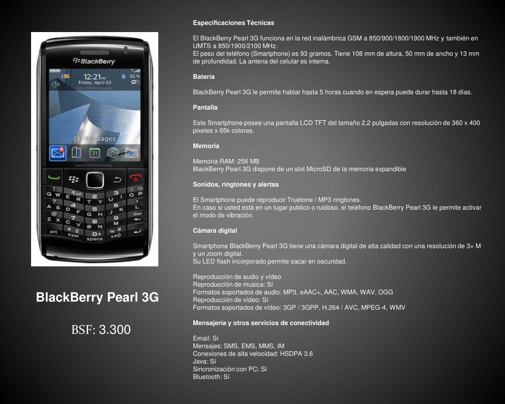 Especificaciones Técnicas El BlackBerry Pearl 3G funciona en la red inalámbrica GSM a 850/900/1800/1900 MHz y también en UMTS a 850/1900/2100 MHz.El peso del teléfono (Smartphone) es 93 gramos. Tiene 108 mm de altura, 50 mm de ancho y 13 mm de profundidad. La antena del celular es interna. Batería BlackBerry Pearl 3G le permite hablar hasta 5 horas cuando en espera puede durar hasta 18 días. Pantalla Este Smartphone posee una pantalla LCD TFT del tamaño 2,2 pulgadas con resolución de 360 x 400 pixeles x 65k colores. Memoria Memoria RAM: 256 MBBlackBerry Pearl 3G dispone de un slot MicroSD de la memoria expandible Sonidos, ringtones y alertas El Smartphone puede reproducir Truetone / MP3 ringtones.En caso si usted está en un lugar publico o ruidoso, el teléfono BlackBerry Pearl 3G le permite activar el modo de vibración. Cámara digital Smartphone BlackBerry Pearl 3G tiene una cámara digital de alta calidad con una resolución de 3+ M y un zoom digital. Su LED flash incorporado permite sacar en oscuridad. Reproducción de audio y vídeo Reproducción de musica: SíFormatos soportados de audio: MP3, eAAC+, AAC, WMA, WAV, OGGReproducción de vídeo: SíFormatos soportados de vídeo: 3GP / 3GPP, H.264 / AVC, MPEG-4, WMV Mensajería y otros servicios de conectividad Email: SíMensajes: SMS, EMS, MMS, IMConexiones de alta velocidad: HSDPA 3.6Java: SíSincronización con PC: SíBluetooth: Sí BlackBerry Pearl 3G BSF: 3.300