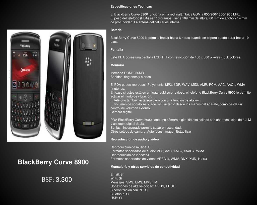 Especificaciones Técnicas El BlackBerry Curve 8900 funciona en la red inalámbrica GSM a 850/900/1800/1900 MHz. El peso del teléfono (PDA) es 110 gramos. Tiene 109 mm de altura, 60 mm de ancho y 14 mm de profundidad. La antena del celular es interna. Batería BlackBerry Curve 8900 le permite hablar hasta 6 horas cuando en espera puede durar hasta 19 días. Pantalla Este PDA posee una pantalla LCD TFT con resolución de 480 x 360 pixeles x 65k colores. Memoria Memoria ROM: 256MB Sonidos, ringtones y alertas El PDA puede reproducir Polyphonic, MP3, 3GP, WAV, MIDI, AMR, PCM, AAC, AAC+, WMA ringtones. En caso si usted está en un lugar publico o ruidoso, el teléfono BlackBerry Curve 8900 le permite activar el modo de vibración. El teléfono también está equipado con una función de altavoz. El volumen de sonido se puede regular tanto desde los menús del aparato, como desde un control de volumen externo. Cámara digital PDA BlackBerry Curve 8900 tiene una cámara digital de alta calidad con una resolución de 3.2 M y un zoom digital de 2x. Su flash incorporado permite sacar en oscuridad. Otros seteos de cámara: Auto focus, Imagen Estabilizar Reproducción de audio y vídeo Reproducción de musica: Sí Formatos soportados de audio: MP3, AAC, AAC+, eAAC+, WMA Reproducción de vídeo: Sí Formatos soportados de vídeo: MPEG-4, WMV, DivX, XviD, H.263 Mensajería y otros servicios de conectividad Email: Sí WiFi: Sí Mensajes: SMS, EMS, MMS, IM Conexiones de alta velocidad: GPRS, EDGE Sincronización con PC: Sí Bluetooth: Sí USB: Sí BlackBerry Curve 8900 BSF:3.300