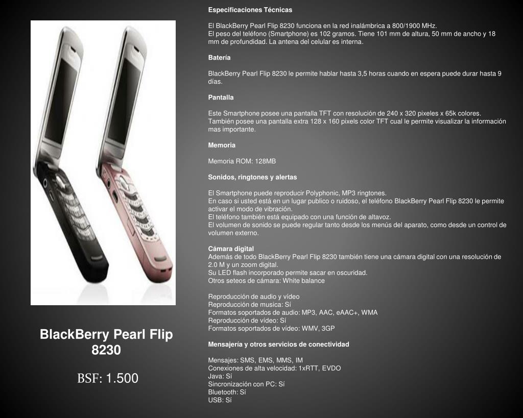 Especificaciones Técnicas El BlackBerry Pearl Flip 8230funciona en la red inalámbrica a 800/1900 MHz.El peso del teléfono (Smartphone) es 102 gramos. Tiene 101 mm de altura, 50 mm de ancho y 18 mm de profundidad. La antena del celular es interna. Batería BlackBerry Pearl Flip 8230 le permite hablar hasta 3,5 horas cuando en espera puede durar hasta 9 días. Pantalla Este Smartphone posee una pantalla TFT con resolución de 240 x 320 pixeles x 65k colores. También posee una pantalla extra 128 x 160 pixels color TFT cual le permite visualizar la información mas importante. Memoria Memoria ROM: 128MB Sonidos, ringtones y alertas El Smartphone puede reproducir Polyphonic, MP3 ringtones.En caso si usted está en un lugar publico o ruidoso, el teléfono BlackBerry Pearl Flip 8230 le permite activar el modo de vibración.El teléfono también está equipado con una función de altavoz.El volumen de sonido se puede regular tanto desde los menús del aparato, como desde un control de volumen externo. Cámara digital Además de todo BlackBerry Pearl Flip 8230 también tiene una cámara digital con una resolución de 2.0 M y un zoom digital. Su LED flash incorporado permite sacar en oscuridad.Otros seteos de cámara: White balance Reproducción de audio y vídeo Reproducción de musica: SíFormatos soportados de audio: MP3, AAC, eAAC+, WMAReproducción de vídeo: SíFormatos soportados de vídeo: WMV, 3GP Mensajería y otros servicios de conectividad Mensajes: SMS, EMS, MMS, IMConexiones de alta velocidad: 1xRTT, EVDOJava: SíSincronización con PC: SíBluetooth: SíUSB: Sí BlackBerry Pearl Flip 8230 BSF: 1.500