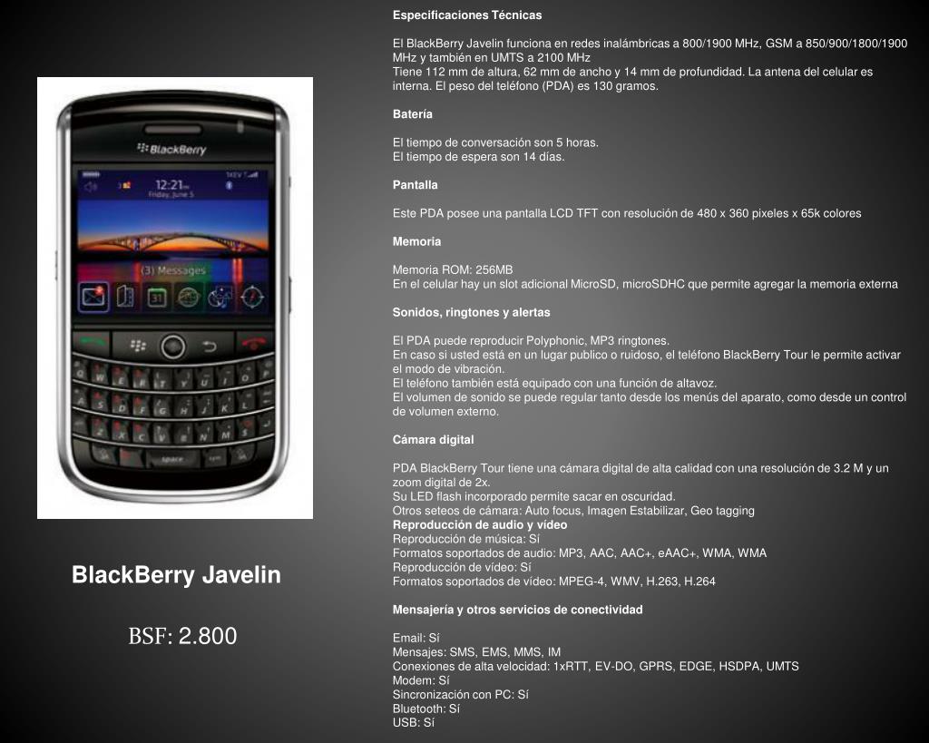 Especificaciones Técnicas El BlackBerry Javelin funciona en redes inalámbricas a 800/1900 MHz, GSM a 850/900/1800/1900 MHz y también en UMTS a 2100 MHzTiene 112 mm de altura, 62 mm de ancho y 14 mm de profundidad. La antena del celular es interna. El peso del teléfono (PDA) es 130 gramos. Batería El tiempo de conversación son 5 horas.El tiempo de espera son 14 días. Pantalla Este PDA posee una pantalla LCD TFT con resolución de 480 x 360 pixeles x 65k colores Memoria Memoria ROM: 256MBEn el celular hay un slot adicional MicroSD, microSDHC que permite agregar la memoria externa Sonidos, ringtones y alertas El PDA puede reproducir Polyphonic, MP3 ringtones.En caso si usted está en un lugar publico o ruidoso, el teléfono BlackBerry Tour le permite activar el modo de vibración.El teléfono también está equipado con una función de altavoz.El volumen de sonido se puede regular tanto desde los menús del aparato, como desde un control de volumen externo. Cámara digital PDA BlackBerry Tour tiene una cámara digital de alta calidad con una resolución de 3.2 M y un zoom digital de 2x.Su LED flash incorporado permite sacar en oscuridad.Otros seteos de cámara: Auto focus, Imagen Estabilizar, Geo tagging Reproducción de audio y vídeo Reproducción de música: SíFormatos soportados de audio: MP3, AAC, AAC+, eAAC+, WMA, WMA Reproducción de vídeo: SíFormatos soportados de vídeo: MPEG-4, WMV, H.263, H.264 Mensajería y otros servicios de conectividad Email: SíMensajes: SMS, EMS, MMS, IMConexiones de alta velocidad: 1xRTT, EV-DO, GPRS, EDGE, HSDPA, UMTSModem: SíSincronización con PC: SíBluetooth: SíUSB: Sí BlackBerry Javelin BSF: 2.800
