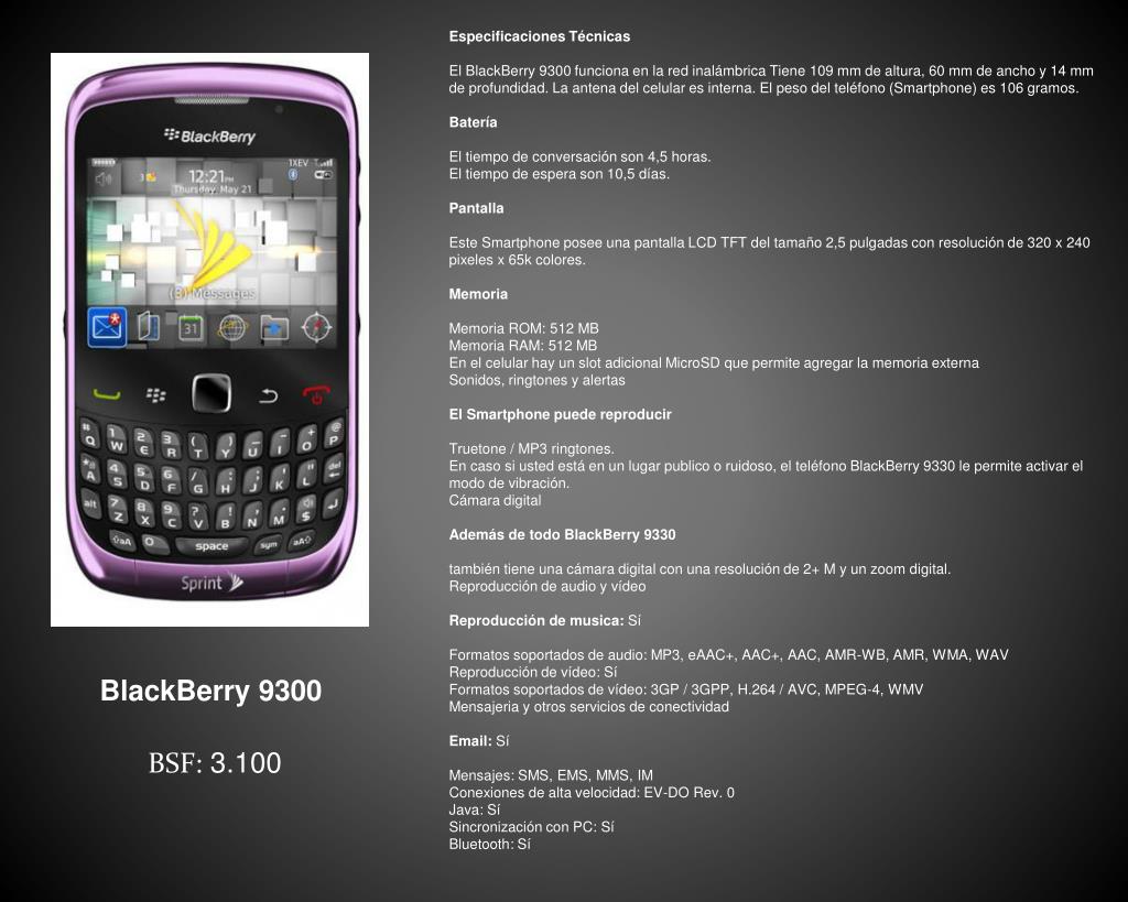 Especificaciones Técnicas El BlackBerry 9300 funciona en la red inalámbrica Tiene 109 mm de altura, 60 mm de ancho y 14 mm de profundidad. La antena del celular es interna. El peso del teléfono (Smartphone) es 106 gramos. Batería El tiempo de conversación son 4,5 horas. El tiempo de espera son 10,5 días. Pantalla Este Smartphone posee una pantalla LCD TFT del tamaño 2,5 pulgadas con resolución de 320 x 240 pixeles x 65k colores. Memoria Memoria ROM: 512 MB Memoria RAM: 512 MB En el celular hay un slot adicional MicroSD que permite agregar la memoria externa Sonidos, ringtones y alertas El Smartphone puede reproducir Truetone / MP3 ringtones. En caso si usted está en un lugar publico o ruidoso, el teléfono BlackBerry 9330 le permite activar el modo de vibración. Cámara digital Además de todo BlackBerry 9330 también tiene una cámara digital con una resolución de 2+ M y un zoom digital. Reproducción de audio y vídeo Reproducción de musica: Sí Formatos soportados de audio: MP3, eAAC+, AAC+, AAC, AMR-WB, AMR, WMA, WAV Reproducción de vídeo: Sí Formatos soportados de vídeo: 3GP / 3GPP, H.264 / AVC, MPEG-4, WMV Mensajeria y otros servicios de conectividad Email: Sí Mensajes: SMS, EMS, MMS, IM Conexiones de alta velocidad: EV-DO Rev. 0 Java: Sí Sincronización con PC: Sí Bluetooth: Sí BlackBerry 9300 BSF:3.100
