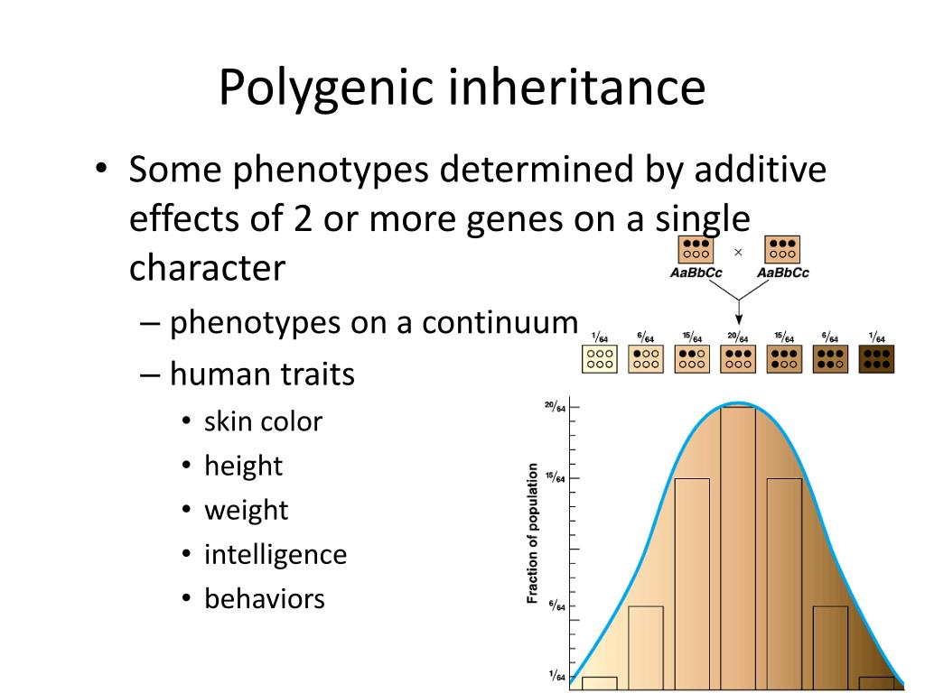 Polygenic inheritance • Some phenotypes determined by additive effects of 2 or more genes on a single character • phenotypes on a continuum • human traits • skin color • height • weight • intelligence • behaviors