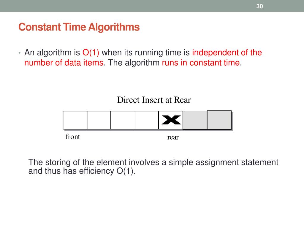 Constant Time Algorithms • An algorithm is O(1) when its running time is independent of the number of data items. The algorithm runs in constant time. The storing of the element involves a simple assignment statement and thus has efficiency O(1).
