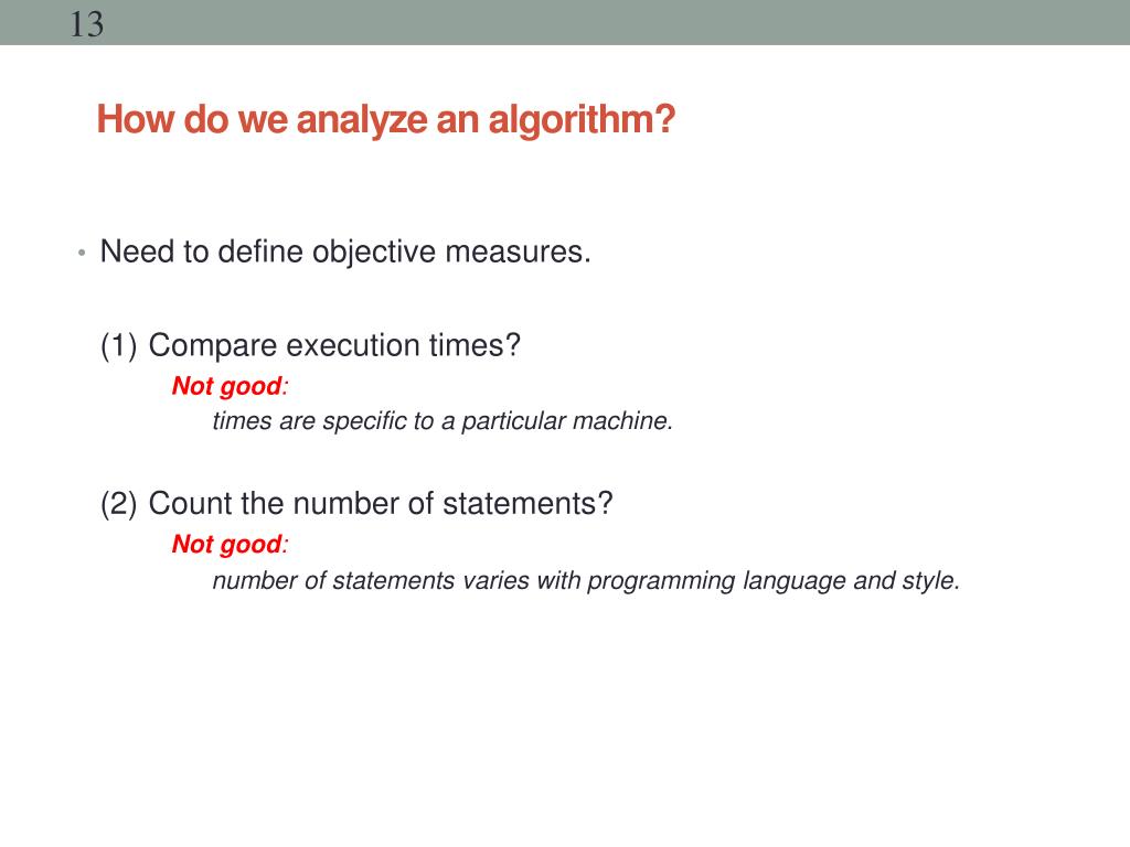 How do we analyze an algorithm? • Need to define objective measures. (1)Compare execution times? Not good: times are specific to a particular machine. (2)Count the number of statements? Not good: number of statements varies with programming language and style.
