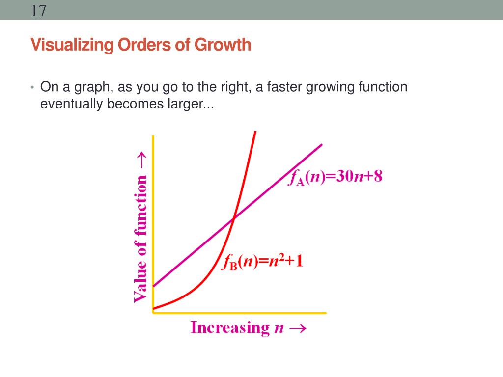 Visualizing Orders of Growth • On a graph, as you go to the right, a faster growing function eventually becomes larger...