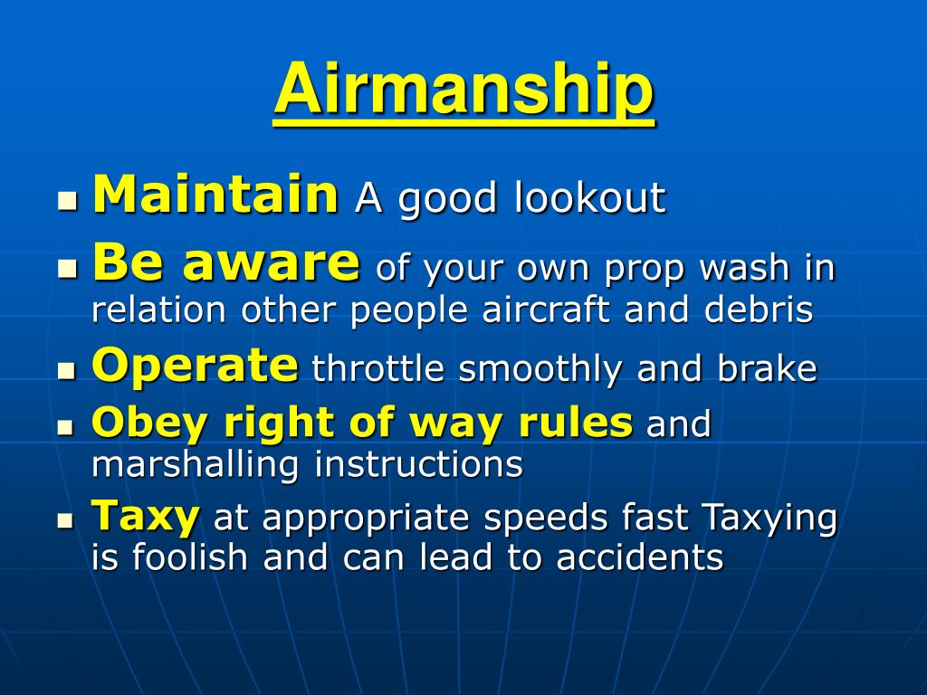Airmanship • Maintain A good lookout • Be awareof your own prop wash in relation other people aircraft and debris • Operate throttle smoothly and brake • Obey right of way rules and marshalling instructions • Taxyat appropriate speeds fast Taxying is foolish and can lead to accidents