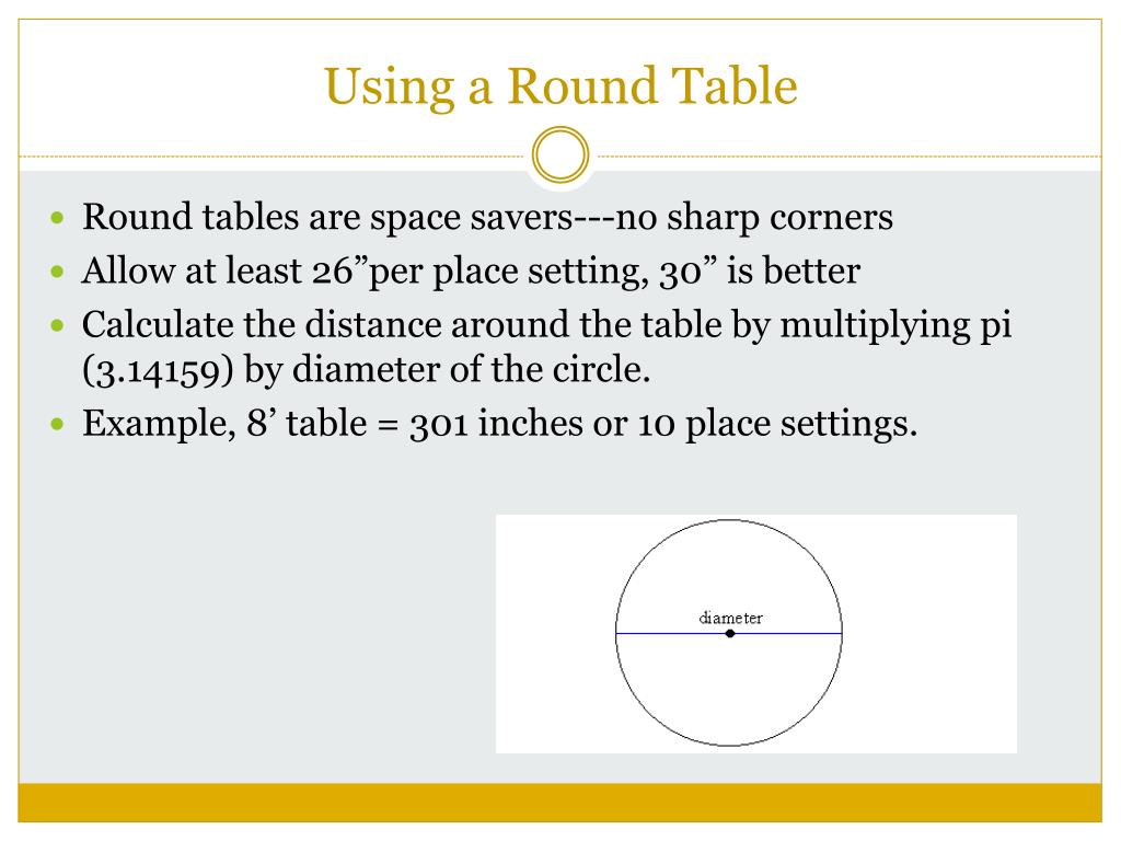 Using a Round Table Round tables are space savers---no sharp corners Allow at least 26”per place setting, 30” is better Calculate the distance around the table by multiplying pi (3.14159) by diameter of the circle. Example, 8’ table = 301 inches or 10 place settings.