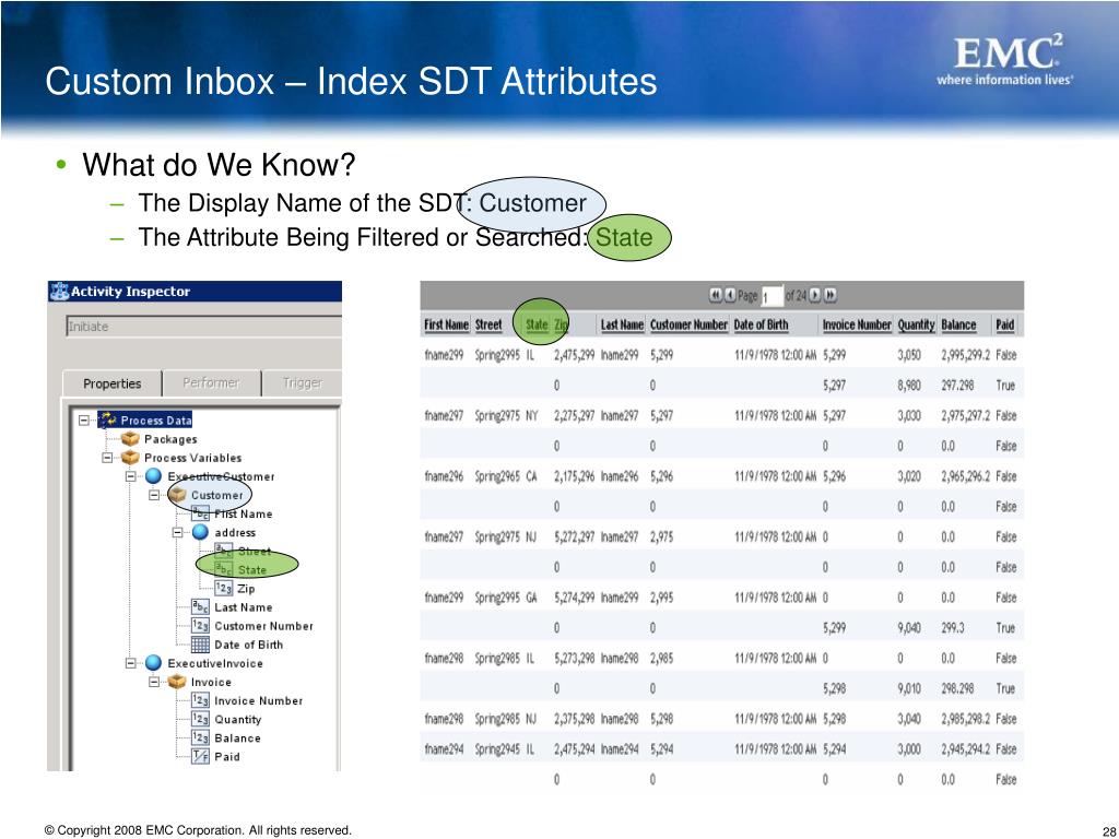 Custom Inbox – Index SDT Attributes • What do We Know? • The Display Name of the SDT: Customer • The Attribute Being Filtered or Searched: State
