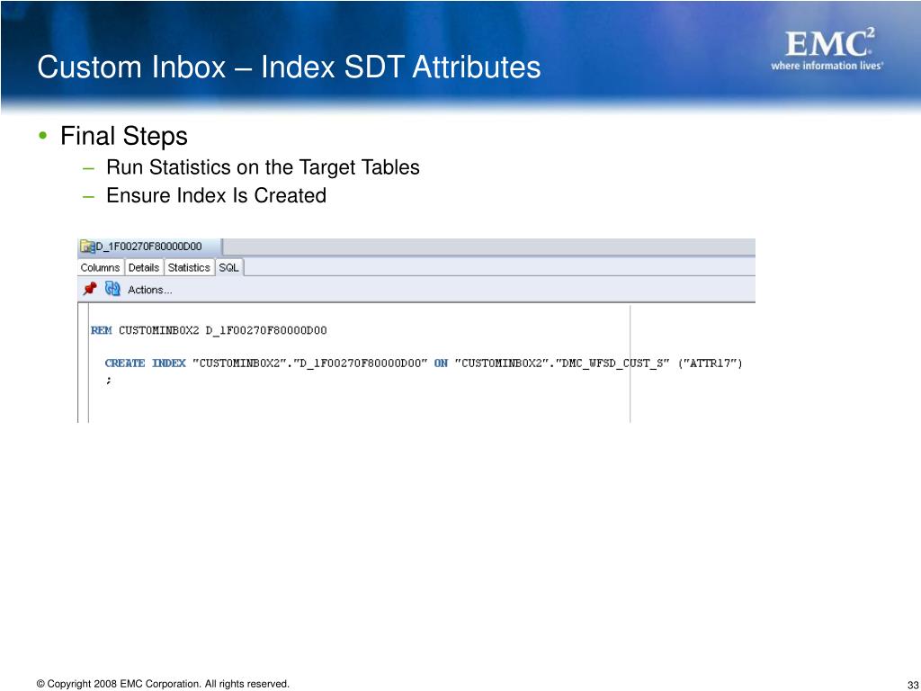 Custom Inbox – Index SDT Attributes • Final Steps • Run Statistics on the Target Tables • Ensure Index Is Created