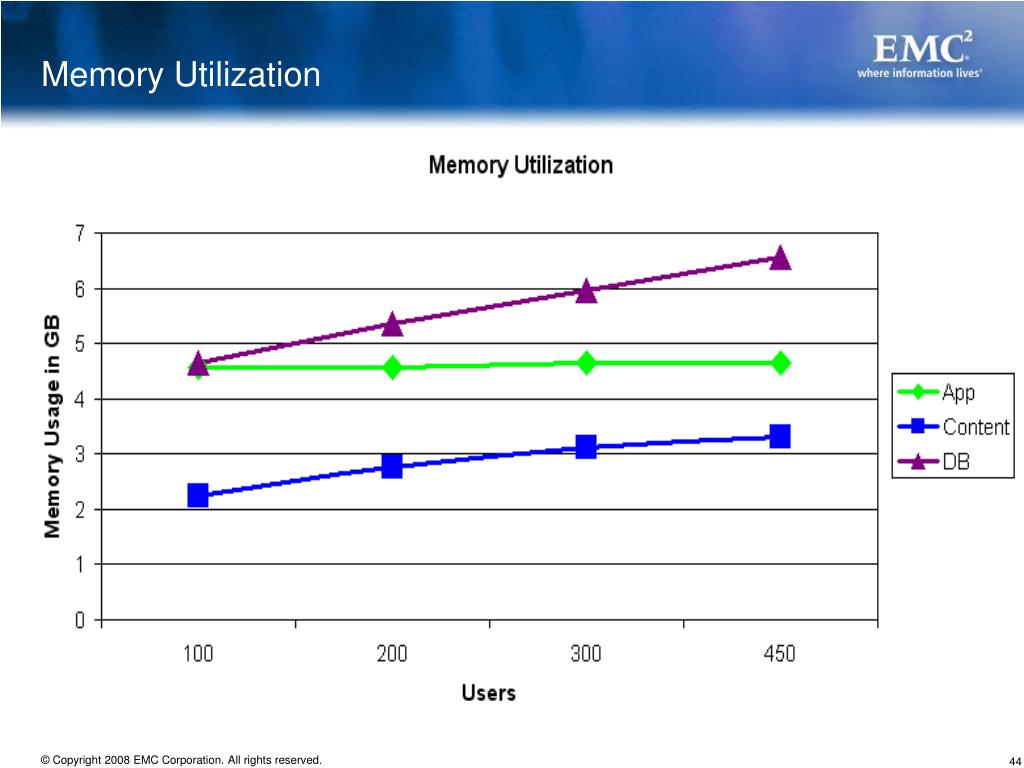 Total Hardware Under $50,000 Benchmark Description • Content Server • One Dell 6850 • Four Intel Pentium 4 80547 (LGA775) 3.66 GHz w/ HT enabled • 12 GB of memory • Dual Gigabit Ethernet ports • 1 TB Internal SCSI • Windows 2003 Server • Two Content Servers installed • Database/Application Server • Two IBM eServer pSeries p5-510 • Four dual-core, 1.65 GHz, 64-bit POWER5 processors • ~219 GB of internal disk, 3 x 7 3 GB 10K rpm Dual Channel Ultra320 SCSI disk drive assembly • 8 GB of memory • Dual Gigabit Ethernet ports • One Fibre Channel connected CLARiiON storage device via one Emulex 2 GB FC host bus adapter (HBA) • 500 GB LUN carved out of a ~4.5 TB 15-drive DAE, RAID level 0 • AIX 5.3