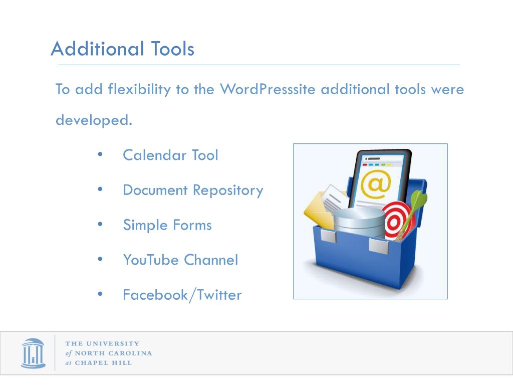 Additional Tools To add flexibility to the WordPresssite additional tools were developed. • Calendar Tool • Document Repository • Simple Forms • YouTube Channel • Facebook/Twitter