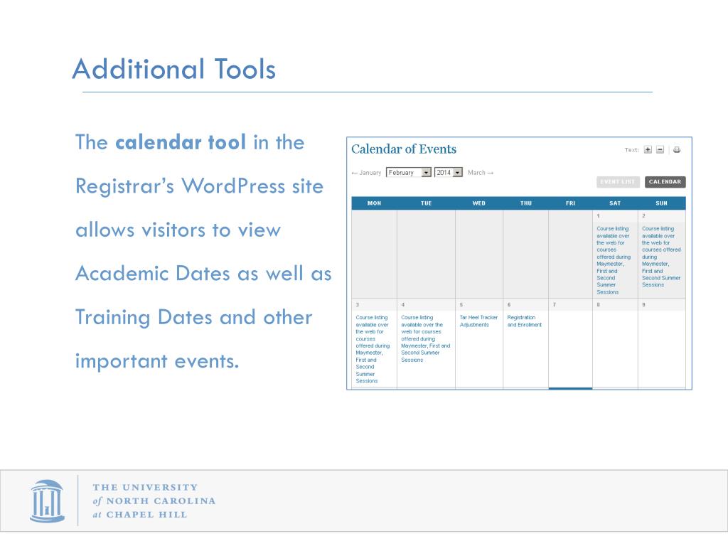 Additional Tools The calendar tool in the Registrar’s WordPress site allows visitors to view Academic Dates as well as Training Dates and other important events.