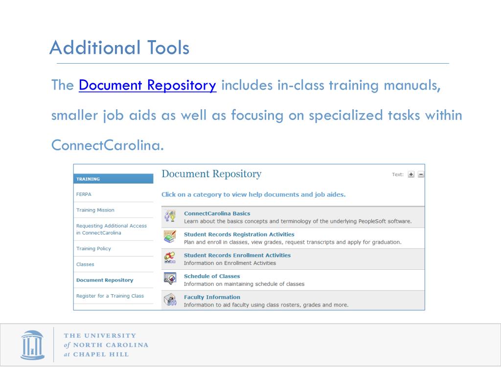 Additional Tools The Document Repositoryincludes in-class training manuals, smaller job aids as well as focusing on specialized tasks within ConnectCarolina.