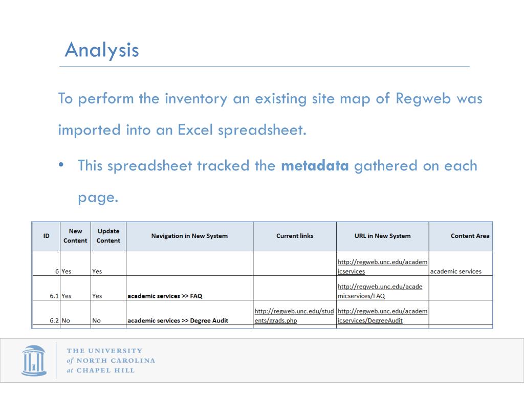 Analysis • To perform the inventory anexisting site map of Regweb was imported into an Excel spreadsheet. • This spreadsheet tracked the metadata gathered on each page.