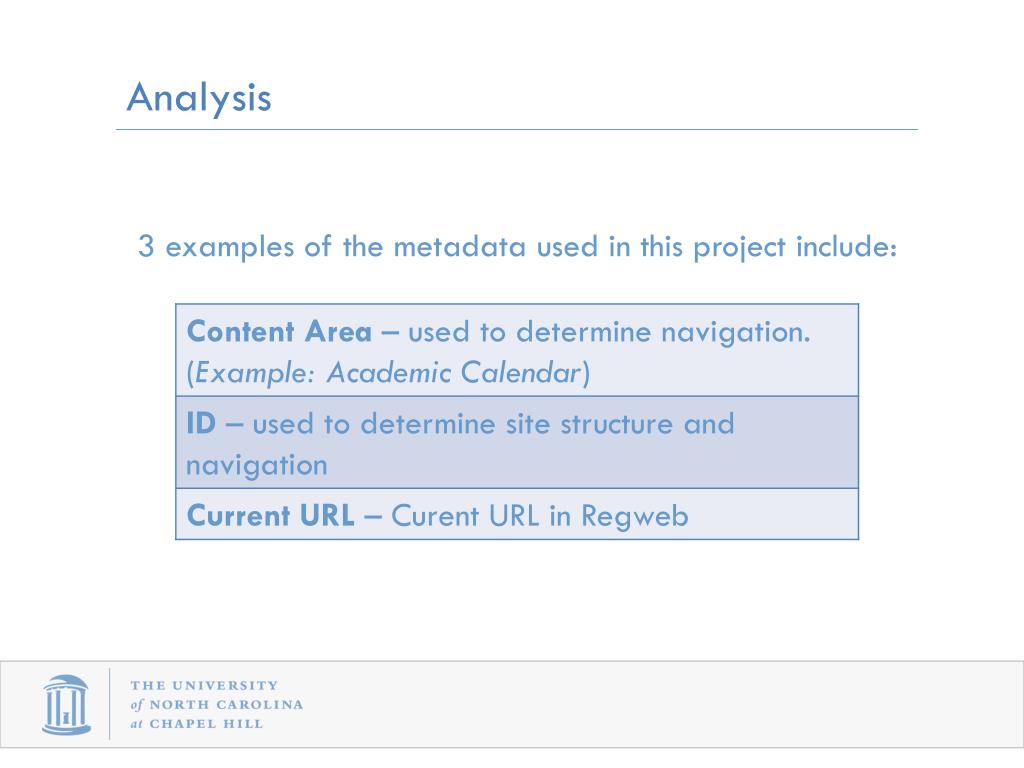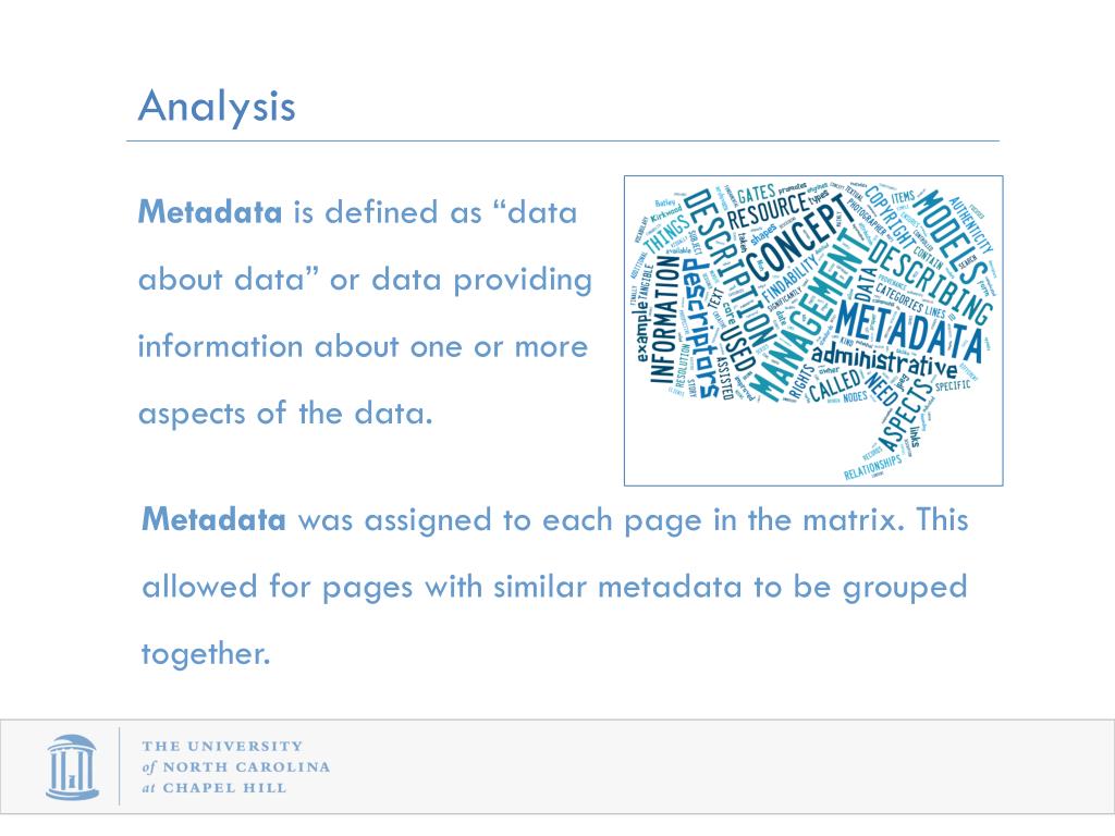 Analysis • Metadata is defined as “data about data” or data providing information about one or more aspects of the data. • Metadata was assigned to each page in the matrix. This allowed for pages with similar metadata to be grouped together.