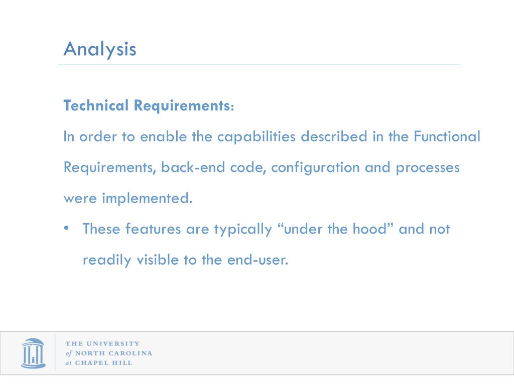 Analysis • Technical Requirements: • In order to enable the capabilities described in the Functional Requirements, back-end code, configuration and processes were implemented. • These features are typically “under the hood” and not readily visible to the end-user.