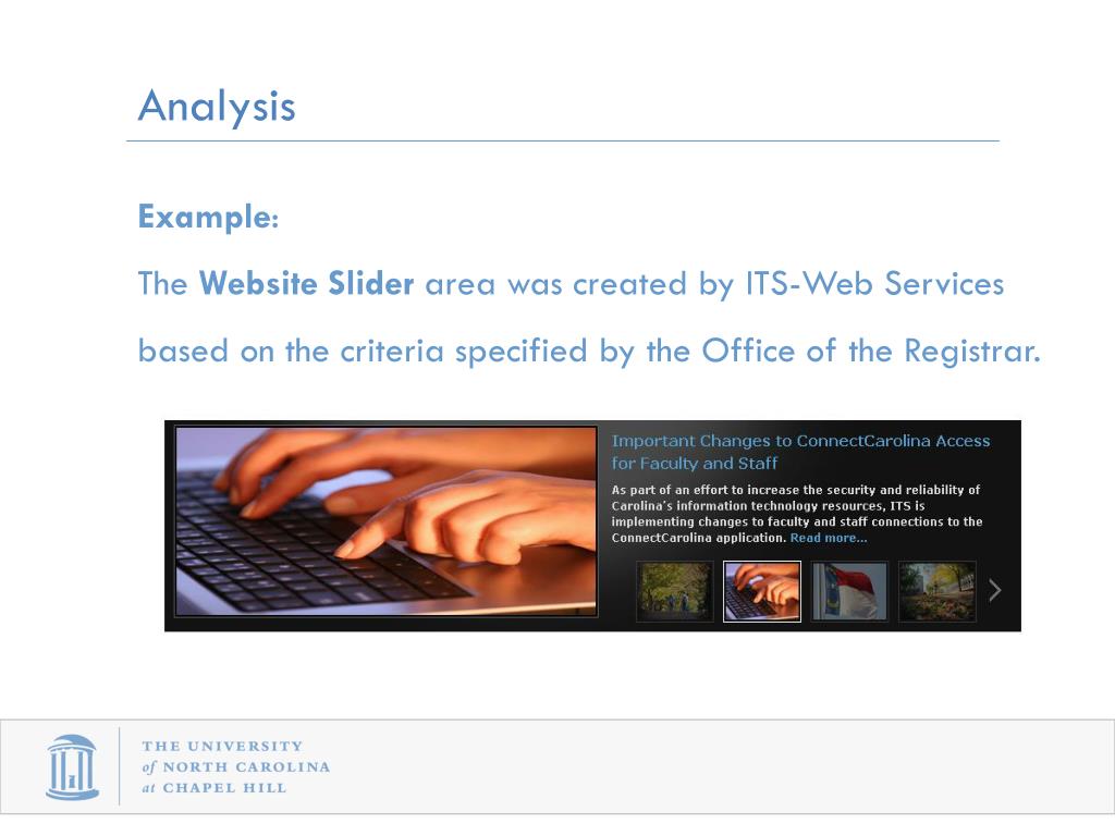 Analysis Example: The Website Slider area was created by ITS-Web Services based on the criteria specified by the Office of the Registrar.