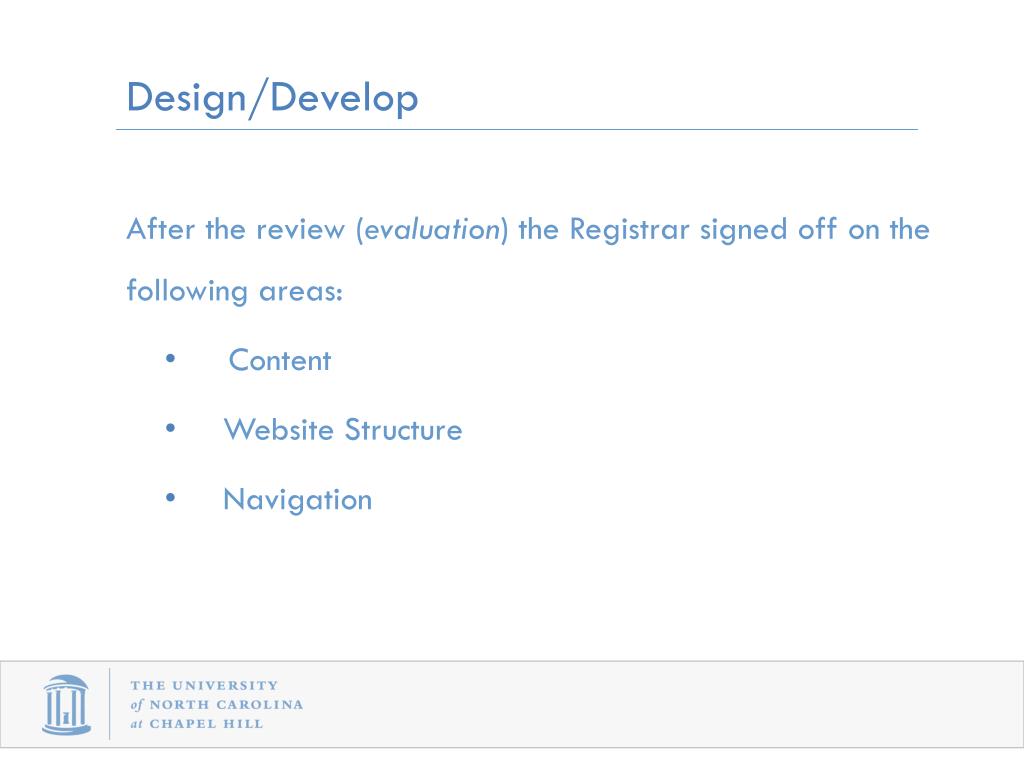 Design/Develop • After the review (evaluation) the Registrar signed off on the following areas: • Content • Website Structure • Navigation