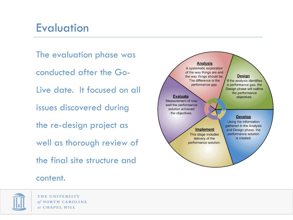 Evaluation The evaluation phase was conducted after the Go-Live date. It focused on all issues discovered during the re-design project as well as thorough review of the final site structure and content.