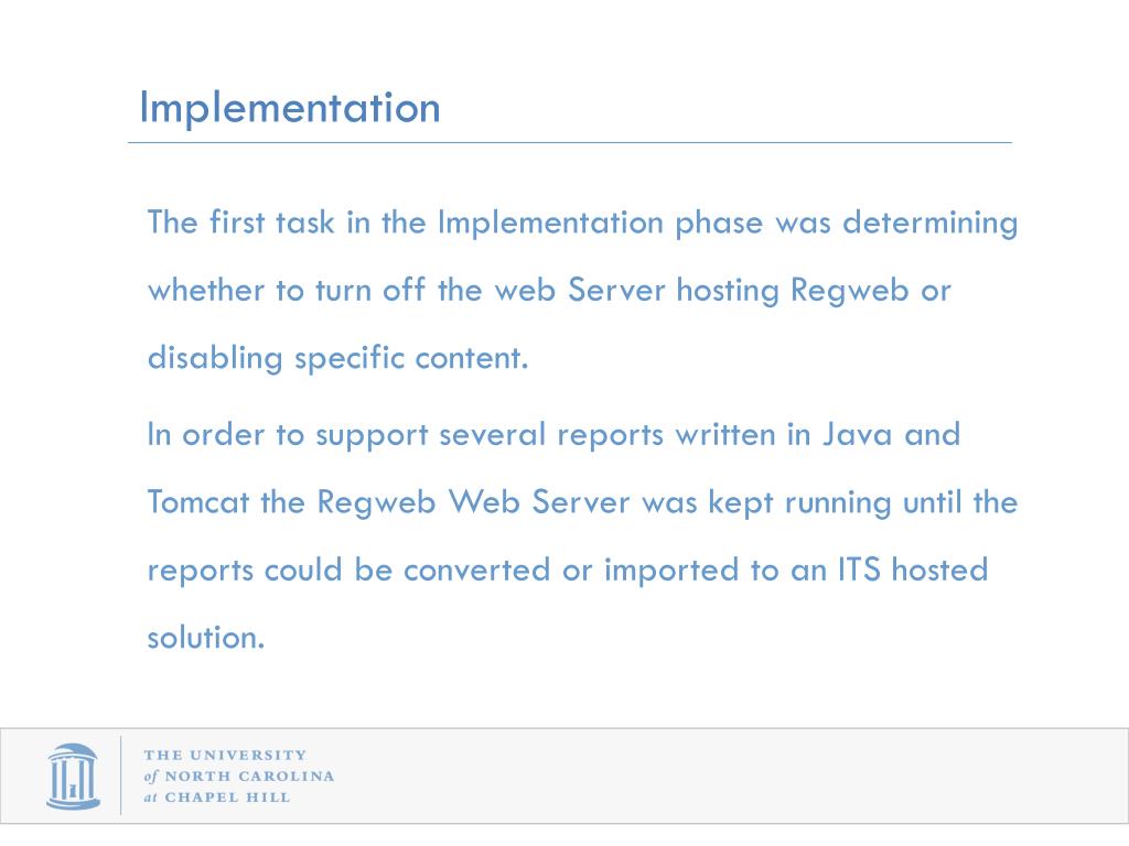 Implementation • The first task in the Implementation phase was determining whether to turn off the web Server hosting Regweb or disabling specific content. • In order to support several reports written in Java and Tomcat the Regweb Web Server was kept running until the reports could be converted or imported to an ITS hosted solution.