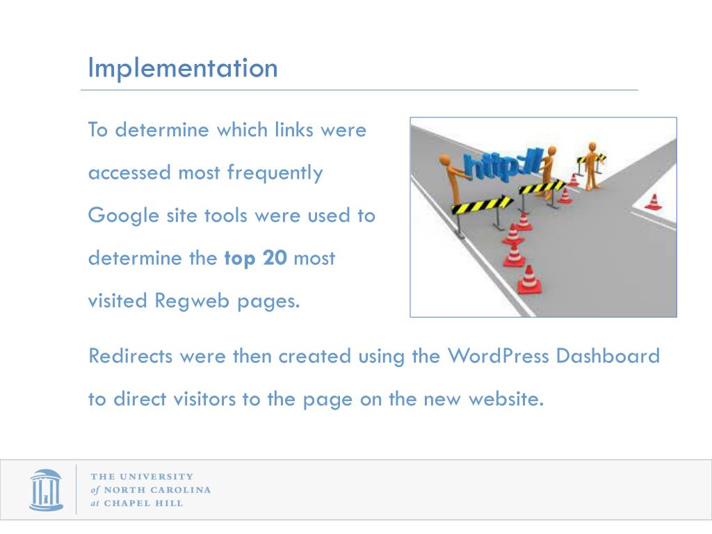 Implementation To determine which links were accessed most frequently Google site tools were usedto determine the top 20 most visited Regweb pages. Redirects were then created using the WordPress Dashboard to direct visitors to the page on the new website.