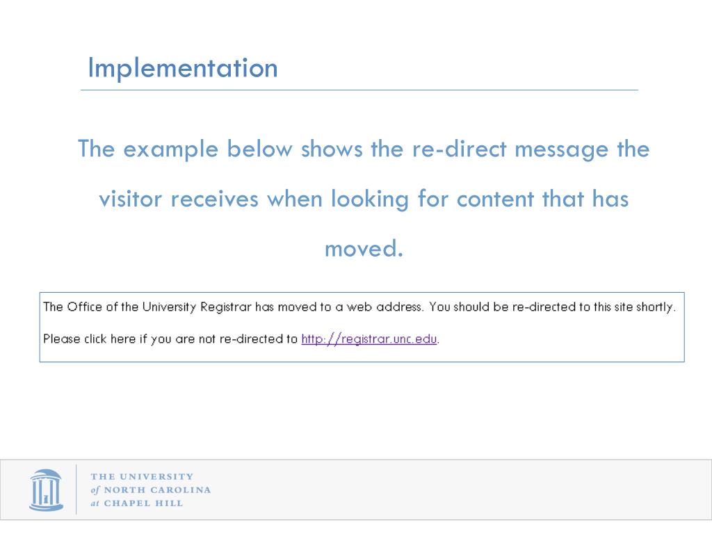 Implementation • The example below shows the re-direct message the visitor receives when looking for content that has moved.