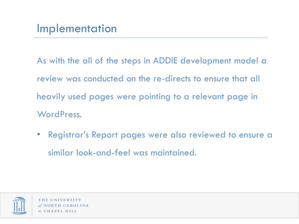 Implementation • As with the all of the steps in ADDIE development model a review was conducted on the re-directs to ensure that all heavily used pages were pointing to a relevant page in WordPress. • Registrar’s Report pages were also reviewed to ensure a similar look-and-feel was maintained.