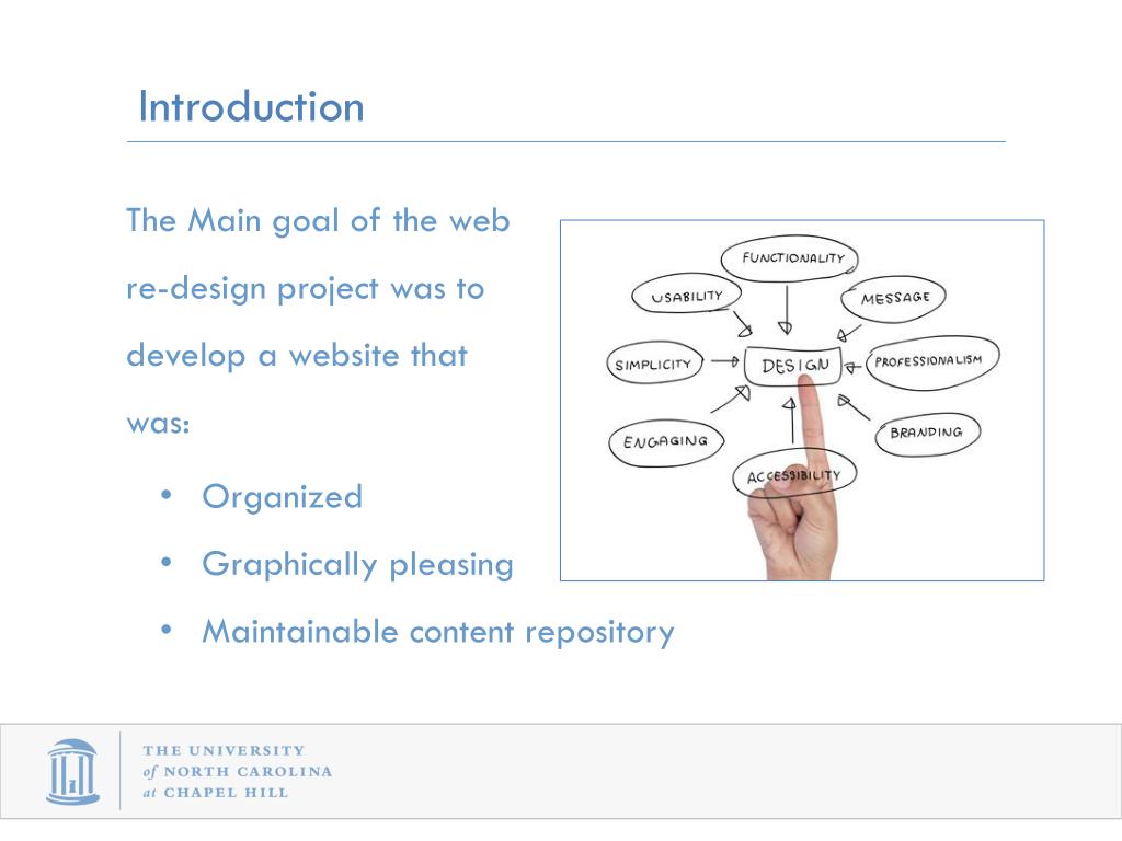 Introduction The Main goal of the web re-design project was to develop a website that was: • Organized • Graphically pleasing • Maintainable content repository