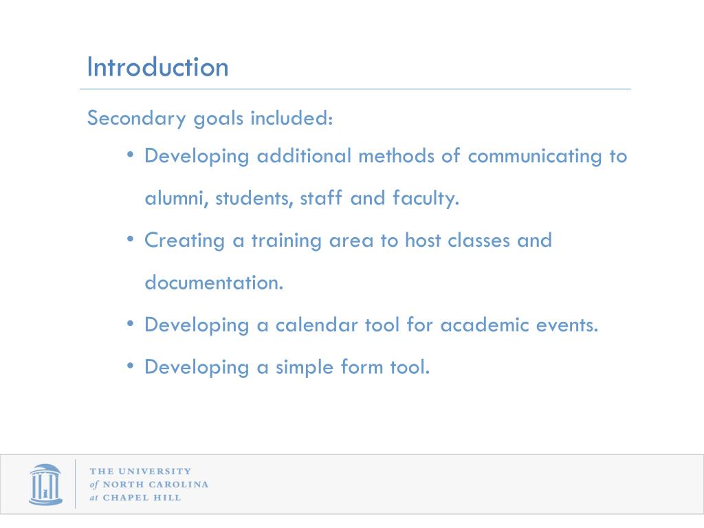 Introduction • Secondary goals included: • Developing additional methods of communicating to alumni, students, staff and faculty. • Creating a training area to host classes and documentation. • Developing a calendar tool for academic events. • Developing a simple form tool.