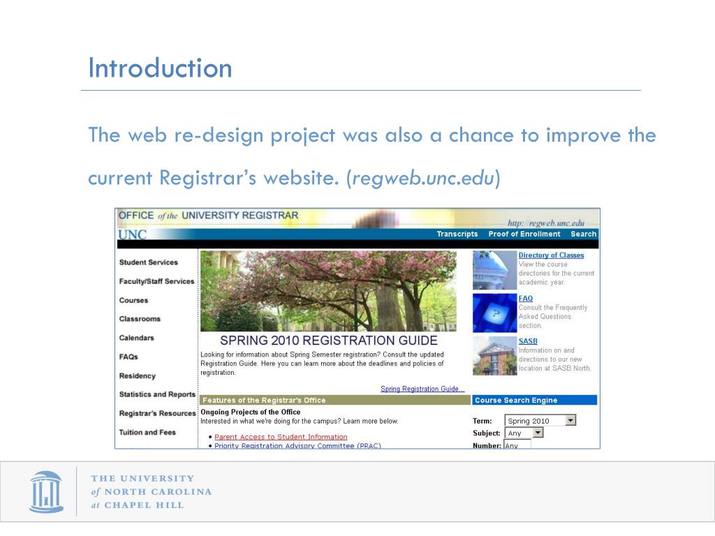 Introduction The web re-design project was also a chance to improve the current Registrar’s website. (regweb.unc.edu)
