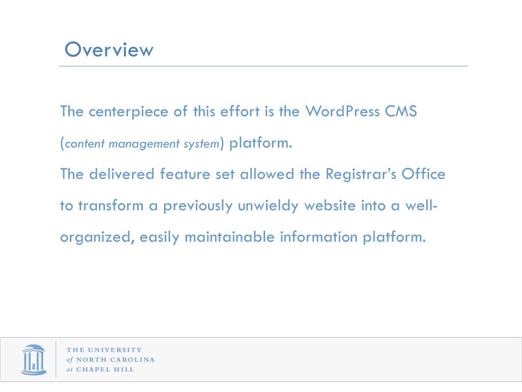 Overview Using these tools the Registrar’s Office has been highly successful with communicating many of the changes that have affected student records at UNC-Chapel Hill and provide a highly usable web resource to the campus community.