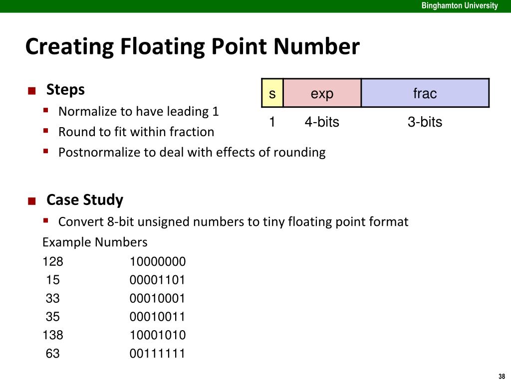 Creating Floating Point Number • Steps • Normalize to have leading 1 • Round to fit within fraction • Postnormalize to deal with effects of rounding • Case Study • Convert 8-bit unsigned numbers to tiny floating point format Example Numbers 12810000000 1500001101 3300010001 3500010011 13810001010 6300111111