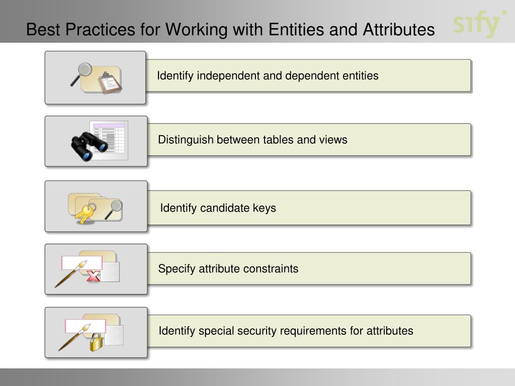 Best Practices for Working with Entities and Attributes Identify independent and dependent entities Distinguish between tables and views Identify candidate keys Specify attribute constraints Identify special security requirements for attributes