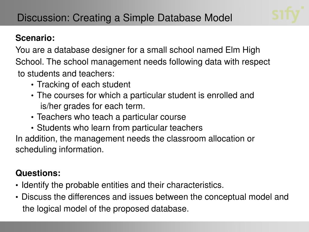 Discussion: Creating a Simple Database Model • Scenario: • You are a database designer for a small school named Elm High • School. The school management needs following data with respect • to students and teachers: • Tracking of each student • The courses for which a particular student is enrolled and • is/her grades for each term. • Teachers who teach a particular course • Students who learn from particular teachers • In addition, the management needs the classroom allocation or • scheduling information. • Questions: • Identify the probable entities and their characteristics. • Discuss the differences and issues between the conceptual model and • the logical model of the proposed database.