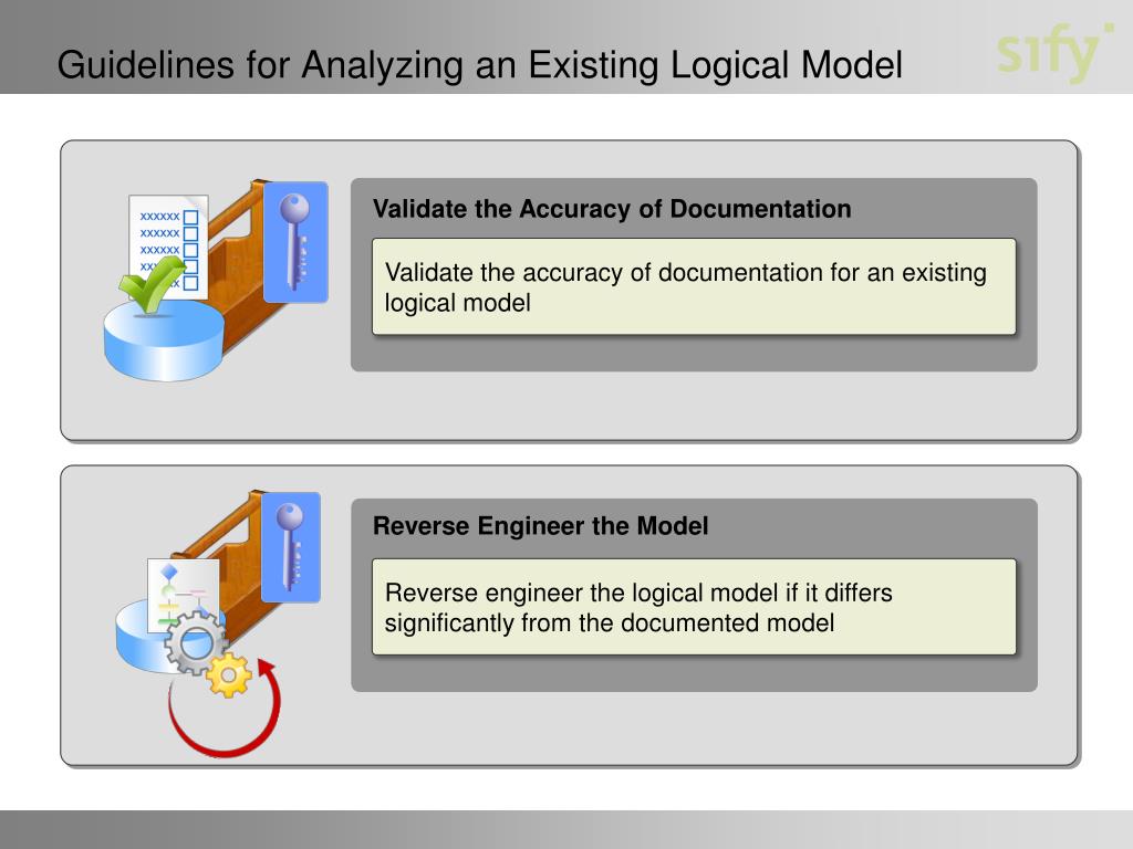 Guidelines for Analyzing an Existing Logical Model Validate the Accuracy of Documentation Validate the accuracy of documentation for an existing logical model Reverse Engineer the Model Reverse engineer the logical model if it differs significantly from the documented model