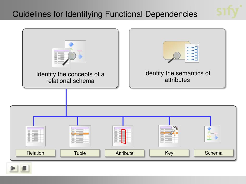 Guidelines for Identifying Functional Dependencies Identify the concepts of a relational schema Identify the semantics of attributes Relation Schema Key Attribute Tuple