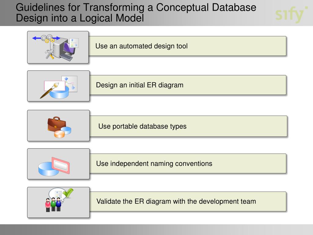 Guidelines for Transforming a Conceptual Database Design into a Logical Model Use an automated design tool Design an initial ER diagram Use portable database types Use independent naming conventions Validate the ER diagram with the development team