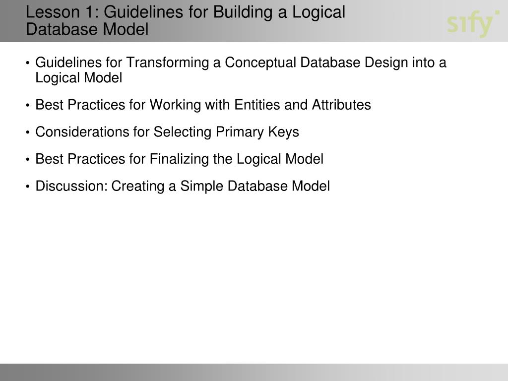 Lesson 1: Guidelines for Building a Logical Database Model • Guidelines for Transforming a Conceptual Database Design into a Logical Model • Best Practices for Working with Entities and Attributes • Considerations for Selecting Primary Keys • Best Practices for Finalizing the Logical Model • Discussion: Creating a Simple Database Model