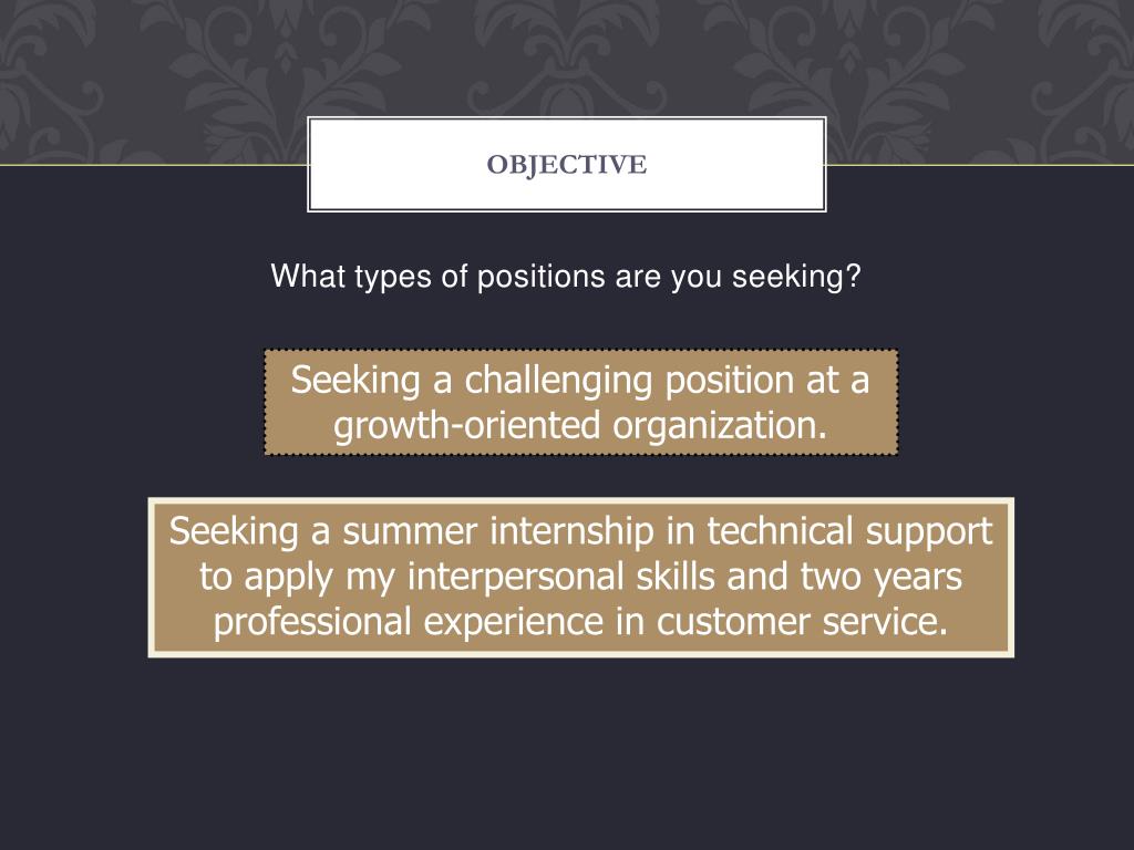 Objective • What types of positions are you seeking? Seeking a challenging position at a growth-oriented organization. Seeking a summer internship in technical support to apply my interpersonal skills and two years professional experience in customer service.