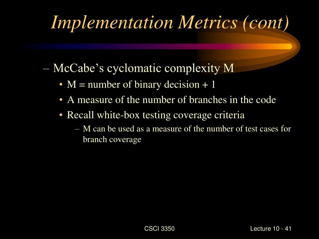 Implementation Metrics (cont) • McCabe’s cyclomatic complexity M • M = number of binary decision + 1 • A measure of the number of branches in the code • Recall white-box testing coverage criteria • M can be used as a measure of the number of test cases for branch coverage CSCI 3350