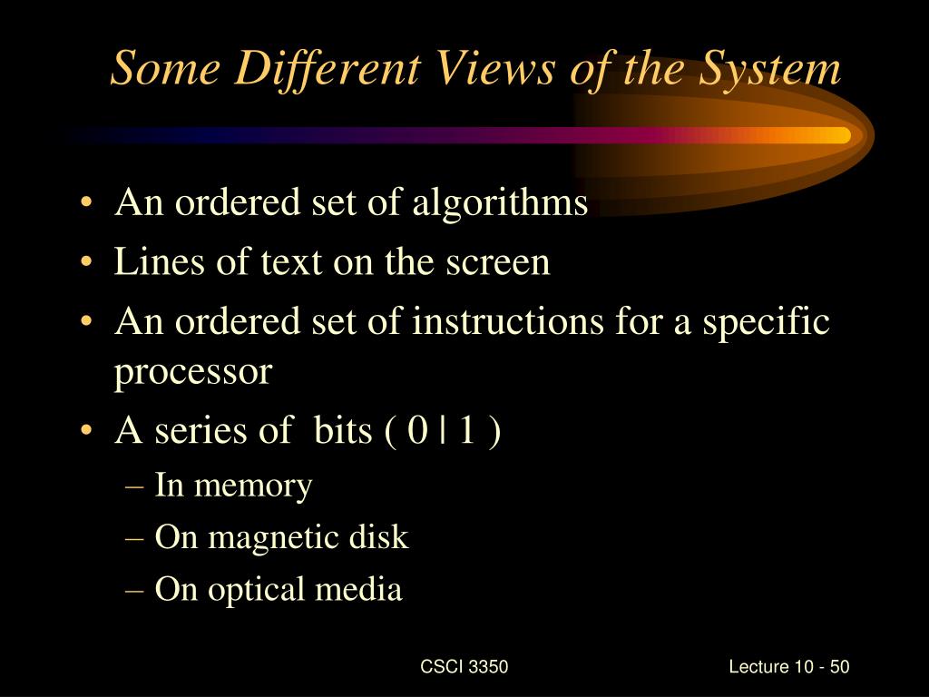 Some Different Views of the System • An ordered set of algorithms • Lines of text on the screen • An ordered set of instructions for a specific processor • A series of bits ( 0 | 1 ) • In memory • On magnetic disk • On optical media CSCI 3350