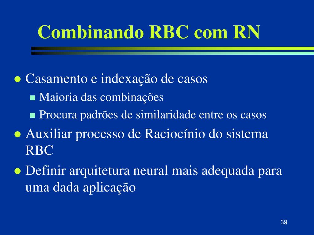 Combinando RBC com RN • RBC e RN têm sido combinados em algumas pesquisas recentes • Integração pode ocorrer por: • Divisão de tarefas entre a RN e o RBC • Projeto de uma arquitetura inteligente combinando características de RN e RBC