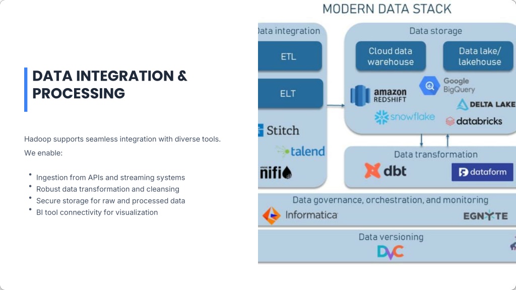 DATA INTEGRATION & PROCESSING Hadoop supports seamless integration with diverse tools. We enable: • Ingestion from APIs and streaming systems • Robust data transformation and cleansing • Secure storage for raw and processed data • BI tool connectivity for visualization