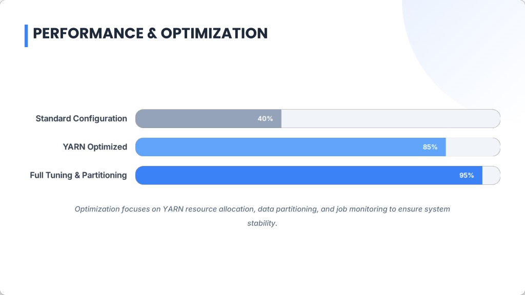 PERFORMANCE & OPTIMIZATION Optimization focuses on YARN resource allocation, data partitioning, and job monitoring to ensure system stability.