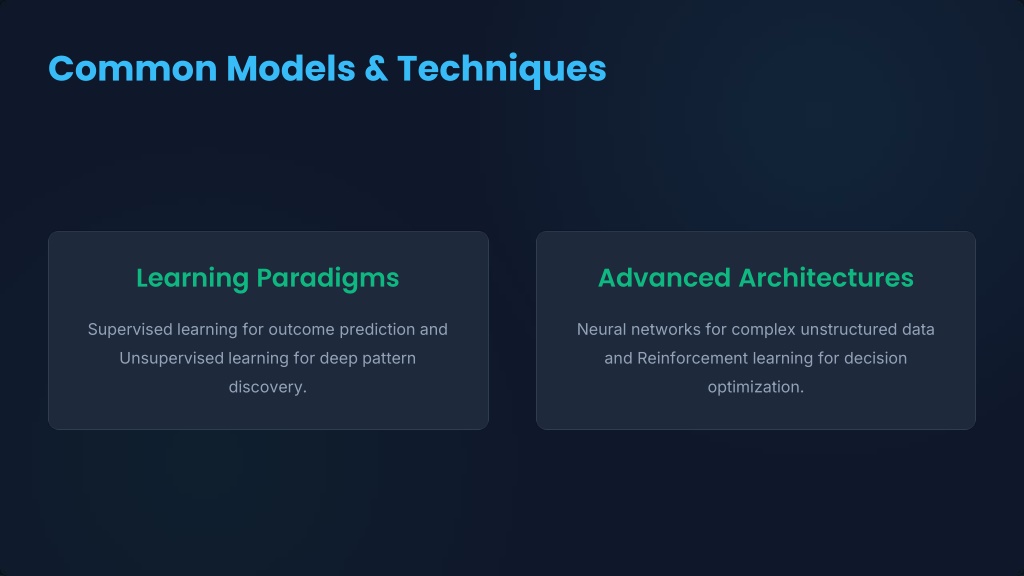 5. Common Models & Techniques Learning Paradigms Advanced Architectures Supervised learning for outcome prediction and Unsupervised learning for deep pattern discovery. Neural networks for complex unstructured data and Reinforcement learning for decision optimization.