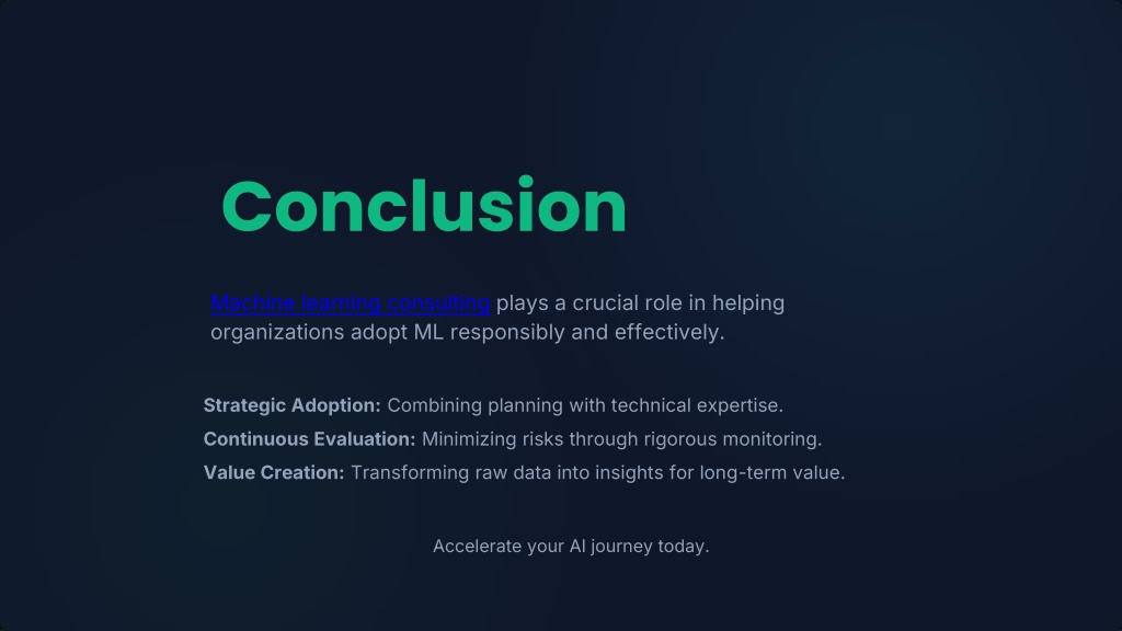 9. Conclusion Machine learning consulting plays a crucial role in helping organizations adopt ML responsibly and effectively. Strategic Adoption: Combining planning with technical expertise. Continuous Evaluation: Minimizing risks through rigorous monitoring. Value Creation: Transforming raw data into insights for long-term value. Accelerate your AI journey today.